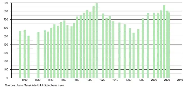 L'évolution du nombre d'habitants est connue à travers les recensements de la population effectués dans la commune depuis 1793. Pour les communes de moins de 10 000 habitants, une enquête de recensement portant sur toute la population est réalisée tous les cinq ans, les populations de référence des années intermédiaires étant quant à elles estimées par interpolation ou extrapolation[15]. Pour la commune, le premier recensement exhaustif entrant dans le cadre du nouveau dispositif a été réalisé en 2005[16].
