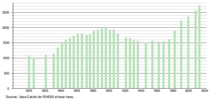 L'évolution du nombre d'habitants est connue à travers les recensements de la population effectués dans la commune depuis 1800. À partir du , les populations légales des communes sont publiées annuellement dans le cadre d'un recensement qui repose désormais sur une collecte d'information annuelle, concernant successivement tous les territoires communaux au cours d'une période de cinq ans. Pour les communes de moins de 10 000 habitants, une enquête de recensement portant sur toute la population est réalisée tous les cinq ans, les populations légales des années intermédiaires étant quant à elles estimées par interpolation ou extrapolation[10]. Pour la commune, le premier recensement exhaustif entrant dans le cadre du nouveau dispositif a été réalisé en 2008[11],[Note 3].