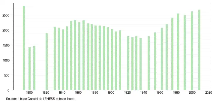 - ↑ Par convention dans Wikipédia, le principe a été retenu de n’afficher dans le tableau des recensements et le graphique, pour les populations légales postérieures à 1999, que les populations correspondant à une enquête exhaustive de recensement pour les communes de moins de 10 000 habitants, et que les populations des années 2006, 2011, 2016, etc. pour les communes de plus de 10 000 habitants, ainsi que la dernière population légale publiée par l’Insee pour l'ensemble des communes.