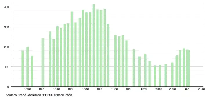 L'évolution du nombre d'habitants est connue à travers les recensements de la population effectués dans la commune depuis 1793. Pour les communes de moins de 10 000 habitants, une enquête de recensement portant sur toute la population est réalisée tous les cinq ans, les populations de référence des années intermédiaires étant quant à elles estimées par interpolation ou extrapolation[22]. Pour la commune, le premier recensement exhaustif entrant dans le cadre du nouveau dispositif a été réalisé en 2005[23].