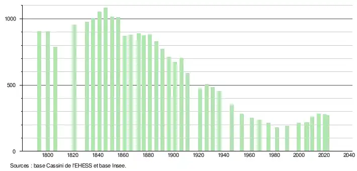 L'évolution du nombre d'habitants est connue à travers les recensements de la population effectués dans la commune depuis 1793. Pour les communes de moins de 10 000 habitants, une enquête de recensement portant sur toute la population est réalisée tous les cinq ans, les populations de référence des années intermédiaires étant quant à elles estimées par interpolation ou extrapolation[11]. Pour la commune, le premier recensement exhaustif entrant dans le cadre du nouveau dispositif a été réalisé en 2005[12].