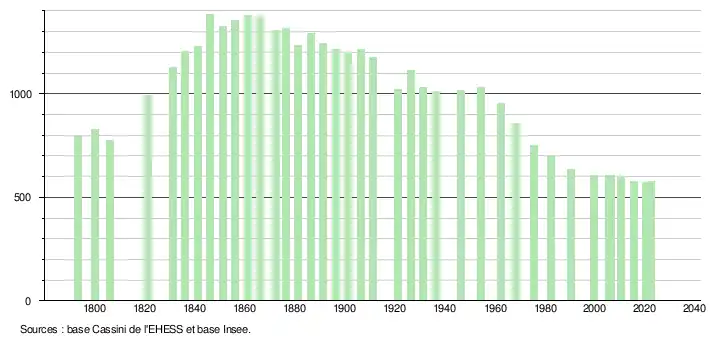 L'évolution du nombre d'habitants est connue à travers les recensements de la population effectués dans la commune depuis 1793. Pour les communes de moins de 10 000 habitants, une enquête de recensement portant sur toute la population est réalisée tous les cinq ans, les populations de référence des années intermédiaires étant quant à elles estimées par interpolation ou extrapolation[25]. Pour la commune, le premier recensement exhaustif entrant dans le cadre du nouveau dispositif a été réalisé en 2005[26].