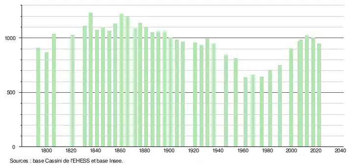 L'évolution du nombre d'habitants est connue à travers les recensements de la population effectués dans la commune depuis 1793. Pour les communes de moins de 10 000 habitants, une enquête de recensement portant sur toute la population est réalisée tous les cinq ans, les populations de référence des années intermédiaires étant quant à elles estimées par interpolation ou extrapolation[22]. Pour la commune, le premier recensement exhaustif entrant dans le cadre du nouveau dispositif a été réalisé en 2007[23].