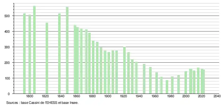 L'évolution du nombre d'habitants est connue à travers les recensements de la population effectués dans la commune depuis 1793. Pour les communes de moins de 10 000 habitants, une enquête de recensement portant sur toute la population est réalisée tous les cinq ans, les populations de référence des années intermédiaires étant quant à elles estimées par interpolation ou extrapolation[17]. Pour la commune, le premier recensement exhaustif entrant dans le cadre du nouveau dispositif a été réalisé en 2005[18].