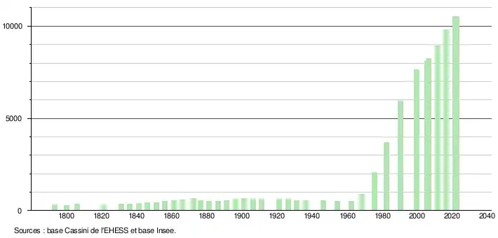 - ↑ Par convention dans Wikipédia, le principe a été retenu de n’afficher dans le tableau des recensements et le graphique, pour les populations de référence postérieures à 1999, que les populations correspondant à une enquête exhaustive de recensement pour les communes de moins de 10 000 habitants, et que les populations des années 2006, 2011, 2016, etc. pour les communes de plus de 10 000 habitants, ainsi que la dernière population de référence publiée par l’Insee pour l'ensemble des communes.