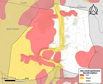 Les mouvements de terrains susceptibles de se produire sur la commune sont des mouvements de terrains, notamment des tassements différentiels[17]. Le retrait-gonflement des sols argileux est susceptible d'engendrer des dommages importants aux bâtiments en cas d’alternance de périodes de sécheresse et de pluie[18]. 65,5 % de la superficie communale est en aléa moyen ou fort (54,9 % au niveau départemental et 48,5 % au niveau national)[Carte 2]. Depuis le , en application de la loi ELAN, différentes contraintes s'imposent aux vendeurs, maîtres d'ouvrages ou constructeurs de biens situés dans une zone classée en aléa moyen ou fort[Note 2],[19].