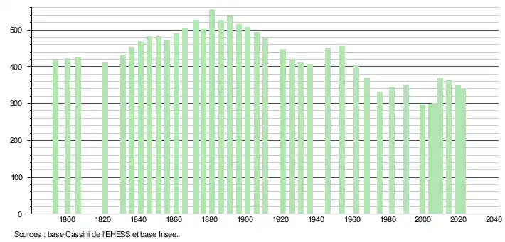 L'évolution du nombre d'habitants est connue à travers les recensements de la population effectués dans la commune depuis 1793. Pour les communes de moins de 10 000 habitants, une enquête de recensement portant sur toute la population est réalisée tous les cinq ans, les populations de référence des années intermédiaires étant quant à elles estimées par interpolation ou extrapolation[23]. Pour la commune, le premier recensement exhaustif entrant dans le cadre du nouveau dispositif a été réalisé en 2004[24].