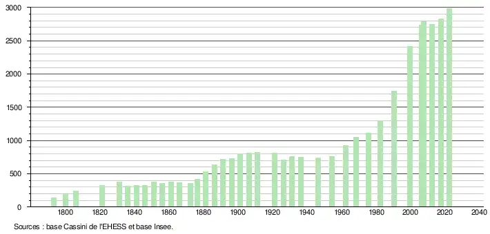 L'évolution du nombre d'habitants est connue à travers les recensements de la population effectués dans la commune depuis 1793. Pour les communes de moins de 10 000 habitants, une enquête de recensement portant sur toute la population est réalisée tous les cinq ans, les populations de référence des années intermédiaires étant quant à elles estimées par interpolation ou extrapolation[28]. Pour la commune, le premier recensement exhaustif entrant dans le cadre du nouveau dispositif a été réalisé en 2007[29].