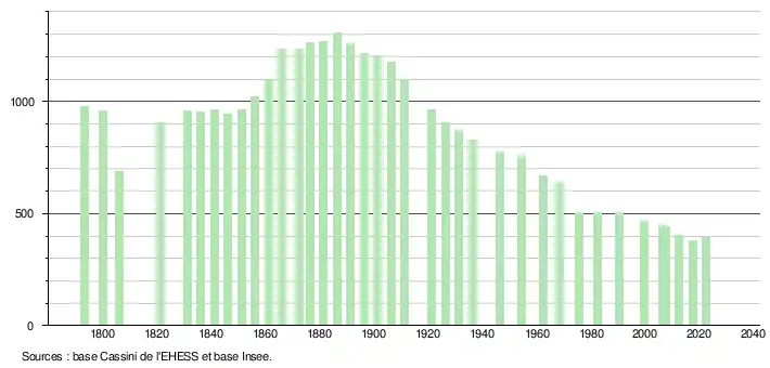 L'évolution du nombre d'habitants est connue à travers les recensements de la population effectués dans la commune depuis 1793. Pour les communes de moins de 10 000 habitants, une enquête de recensement portant sur toute la population est réalisée tous les cinq ans, les populations de référence des années intermédiaires étant quant à elles estimées par interpolation ou extrapolation[20]. Pour la commune, le premier recensement exhaustif entrant dans le cadre du nouveau dispositif a été réalisé en 2007[21].