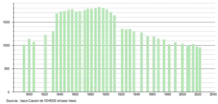 L'évolution du nombre d'habitants est connue à travers les recensements de la population effectués dans la commune depuis 1793. Pour les communes de moins de 10 000 habitants, une enquête de recensement portant sur toute la population est réalisée tous les cinq ans, les populations de référence des années intermédiaires étant quant à elles estimées par interpolation ou extrapolation[24]. Pour la commune, le premier recensement exhaustif entrant dans le cadre du nouveau dispositif a été réalisé en 2008[25].