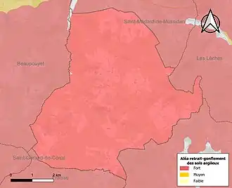 Les mouvements de terrains susceptibles de se produire sur la commune sont des tassements différentiels[41]. Le retrait-gonflement des sols argileux est susceptible d'engendrer des dommages importants aux bâtiments en cas d’alternance de périodes de sécheresse et de pluie[42]. 99,9 % de la superficie communale est en aléa moyen ou fort (58,6 % au niveau départemental et 48,5 % au niveau national métropolitain)[Carte 4]. Depuis le , en application de la loi ÉLAN, différentes contraintes s'imposent aux vendeurs, maîtres d'ouvrages ou constructeurs de biens situés dans une zone classée en aléa moyen ou fort[Note 3],[43].