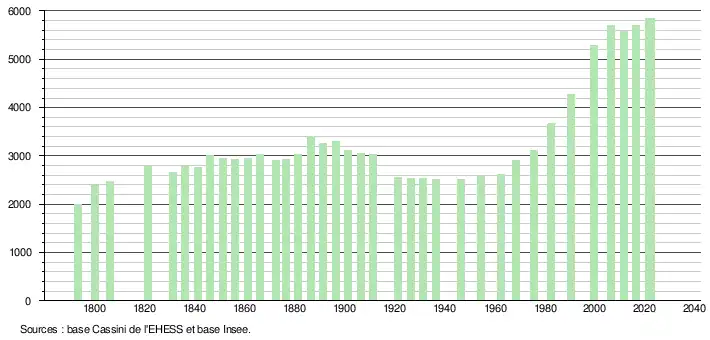L'évolution du nombre d'habitants est connue à travers les recensements de la population effectués dans la commune depuis 1793. Pour les communes de moins de 10000habitants, une enquête de recensement portant sur toute la population est réalisée tous les cinqans, les populations de référence des années intermédiaires étant quant à elles estimées par interpolation ou extrapolation[19]. Pour la commune, le premier recensement exhaustif entrant dans le cadre du nouveau dispositif a été réalisé en 2006[20].