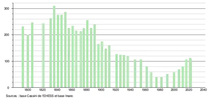 L'évolution du nombre d'habitants est connue à travers les recensements de la population effectués dans la commune depuis 1793. Pour les communes de moins de 10 000 habitants, une enquête de recensement portant sur toute la population est réalisée tous les cinq ans, les populations de référence des années intermédiaires étant quant à elles estimées par interpolation ou extrapolation[26]. Pour la commune, le premier recensement exhaustif entrant dans le cadre du nouveau dispositif a été réalisé en 2006[27].