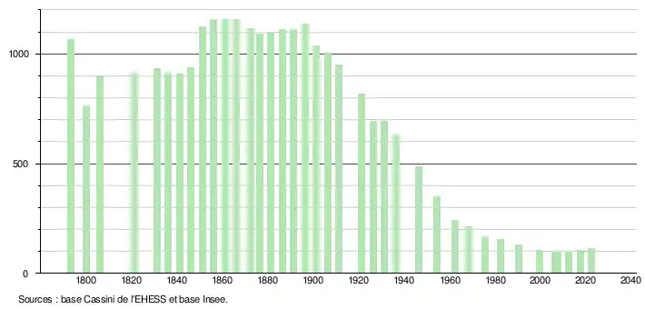 L'évolution du nombre d'habitants est connue à travers les recensements de la population effectués dans la commune depuis 1793. Pour les communes de moins de 10 000 habitants, une enquête de recensement portant sur toute la population est réalisée tous les cinq ans, les populations de référence des années intermédiaires étant quant à elles estimées par interpolation ou extrapolation[16]. Pour la commune, le premier recensement exhaustif entrant dans le cadre du nouveau dispositif a été réalisé en 2007[17].