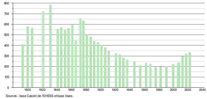 L'évolution du nombre d'habitants est connue à travers les recensements de la population effectués dans la commune depuis 1793. Pour les communes de moins de 10 000 habitants, une enquête de recensement portant sur toute la population est réalisée tous les cinq ans, les populations de référence des années intermédiaires étant quant à elles estimées par interpolation ou extrapolation[16]. Pour la commune, le premier recensement exhaustif entrant dans le cadre du nouveau dispositif a été réalisé en 2007[17].