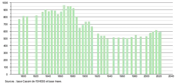 L'évolution du nombre d'habitants est connue à travers les recensements de la population effectués dans la commune depuis 1793. Pour les communes de moins de 10 000 habitants, une enquête de recensement portant sur toute la population est réalisée tous les cinq ans, les populations de référence des années intermédiaires étant quant à elles estimées par interpolation ou extrapolation[29]. Pour la commune, le premier recensement exhaustif entrant dans le cadre du nouveau dispositif a été réalisé en 2005[30].