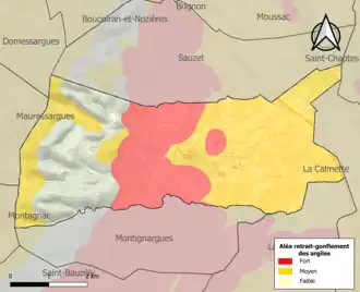 Le retrait-gonflement des sols argileux est susceptible d'engendrer des dommages importants aux bâtiments en cas d’alternance de périodes de sécheresse et de pluie. 76,8 % de la superficie communale est en aléa moyen ou fort (67,5 % au niveau départemental et 48,5 % au niveau national). Sur les 1 007 bâtiments dénombrés sur la commune en 2019, 1007 sont en aléa moyen ou fort, soit 100 %, à comparer aux 90 % au niveau départemental et 54 % au niveau national. Une cartographie de l'exposition du territoire national au retrait gonflement des sols argileux est disponible sur le site du BRGM[20],[Carte 2].