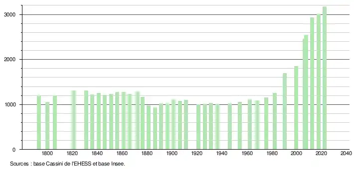 L'évolution du nombre d'habitants est connue à travers les recensements de la population effectués dans la commune depuis 1793. Pour les communes de moins de 10 000 habitants, une enquête de recensement portant sur toute la population est réalisée tous les cinq ans, les populations de référence des années intermédiaires étant quant à elles estimées par interpolation ou extrapolation[28]. Pour la commune, le premier recensement exhaustif entrant dans le cadre du nouveau dispositif a été réalisé en 2007[29].