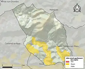 Le retrait-gonflement des sols argileux est susceptible d'engendrer des dommages importants aux bâtiments en cas d’alternance de périodes de sécheresse et de pluie. 17,4 % de la superficie communale est en aléa moyen ou fort (59,3 % au niveau départemental et 48,5 % au niveau national). Sur les 137 bâtiments dénombrés sur la commune en 2019, 110 sont en aléa moyen ou fort, soit 80 %, à comparer aux 85 % au niveau départemental et 54 % au niveau national. Une cartographie de l'exposition du territoire national au retrait gonflement des sols argileux est disponible sur le site du BRGM[25],[Carte 2].