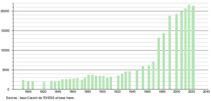 - ↑ Par convention dans Wikipédia, le principe a été retenu de n’afficher dans le tableau des recensements et le graphique, pour les populations de référence postérieures à 1999, que les populations correspondant à une enquête exhaustive de recensement pour les communes de moins de 10 000 habitants, et que les populations des années 2006, 2011, 2016, etc. pour les communes de plus de 10 000 habitants, ainsi que la dernière population de référence publiée par l’Insee pour l'ensemble des communes.
