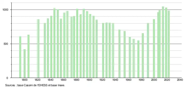 L'évolution du nombre d'habitants est connue à travers les recensements de la population effectués dans la commune depuis 1793. Pour les communes de moins de 10 000 habitants, une enquête de recensement portant sur toute la population est réalisée tous les cinq ans, les populations de référence des années intermédiaires étant quant à elles estimées par interpolation ou extrapolation[14]. Pour la commune, le premier recensement exhaustif entrant dans le cadre du nouveau dispositif a été réalisé en 2008[15].