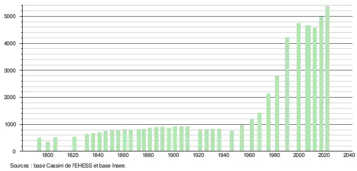 L'évolution du nombre d'habitants est connue à travers les recensements de la population effectués dans la commune depuis 1793. Pour les communes de moins de 10 000 habitants, une enquête de recensement portant sur toute la population est réalisée tous les cinq ans, les populations de référence des années intermédiaires étant quant à elles estimées par interpolation ou extrapolation[19]. Pour la commune, le premier recensement exhaustif entrant dans le cadre du nouveau dispositif a été réalisé en 2007[20].