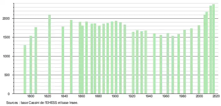 L'évolution du nombre d'habitants est connue à travers les recensements de la population effectués dans la commune depuis 1793. Pour les communes de moins de 10 000 habitants, une enquête de recensement portant sur toute la population est réalisée tous les cinq ans, les populations de référence des années intermédiaires étant quant à elles estimées par interpolation ou extrapolation[18]. Pour la commune, le premier recensement exhaustif entrant dans le cadre du nouveau dispositif a été réalisé en 2008[19].