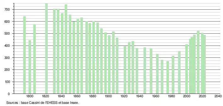 L'évolution du nombre d'habitants est connue à travers les recensements de la population effectués dans la commune depuis 1793. Pour les communes de moins de 10 000 habitants, une enquête de recensement portant sur toute la population est réalisée tous les cinq ans, les populations de référence des années intermédiaires étant quant à elles estimées par interpolation ou extrapolation[26]. Pour la commune, le premier recensement exhaustif entrant dans le cadre du nouveau dispositif a été réalisé en 2004[27].