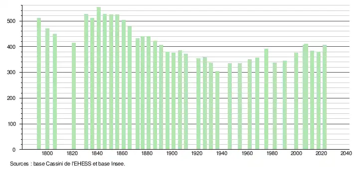 L'évolution du nombre d'habitants est connue à travers les recensements de la population effectués dans la commune depuis 1793. Pour les communes de moins de 10 000 habitants, une enquête de recensement portant sur toute la population est réalisée tous les cinq ans, les populations de référence des années intermédiaires étant quant à elles estimées par interpolation ou extrapolation[16]. Pour la commune, le premier recensement exhaustif entrant dans le cadre du nouveau dispositif a été réalisé en 2007[17].