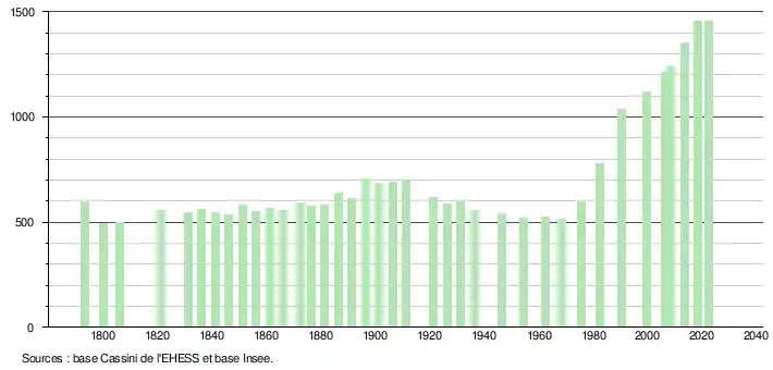 L'évolution du nombre d'habitants est connue à travers les recensements de la population effectués dans la commune depuis 1793. Pour les communes de moins de 10 000 habitants, une enquête de recensement portant sur toute la population est réalisée tous les cinq ans, les populations de référence des années intermédiaires étant quant à elles estimées par interpolation ou extrapolation[18]. Pour la commune, le premier recensement exhaustif entrant dans le cadre du nouveau dispositif a été réalisé en 2008[19].