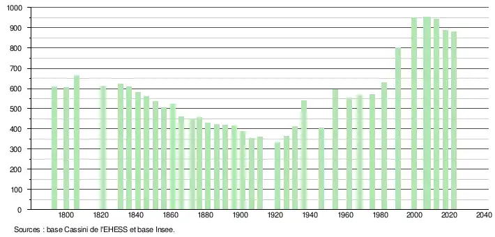 L'évolution du nombre d'habitants est connue à travers les recensements de la population effectués dans la commune depuis 1793. Pour les communes de moins de 10 000 habitants, une enquête de recensement portant sur toute la population est réalisée tous les cinq ans, les populations de référence des années intermédiaires étant quant à elles estimées par interpolation ou extrapolation[22]. Pour la commune, le premier recensement exhaustif entrant dans le cadre du nouveau dispositif a été réalisé en 2007[23].