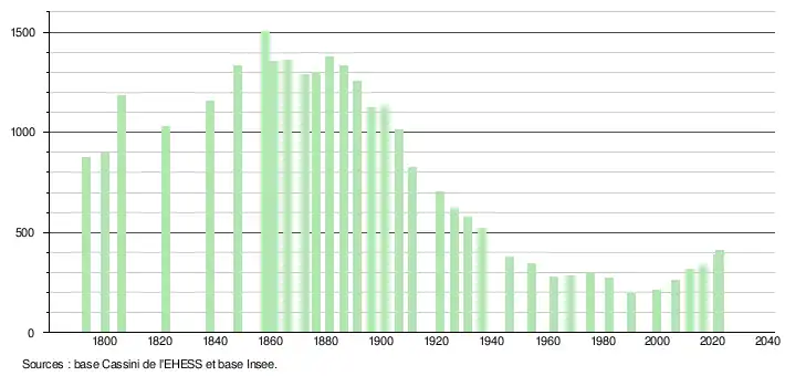 L'évolution du nombre d'habitants est connue à travers les recensements de la population effectués dans la commune depuis 1793. Pour les communes de moins de 10 000 habitants, une enquête de recensement portant sur toute la population est réalisée tous les cinq ans, les populations de référence des années intermédiaires étant quant à elles estimées par interpolation ou extrapolation[11]. Pour la commune, le premier recensement exhaustif entrant dans le cadre du nouveau dispositif a été réalisé en 2006[12].
