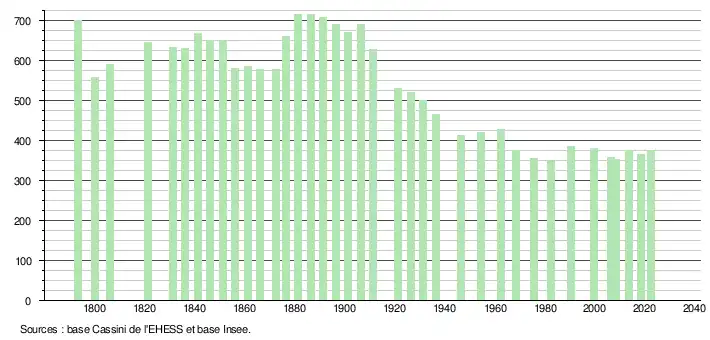 L'évolution du nombre d'habitants est connue à travers les recensements de la population effectués dans la commune depuis 1793. Pour les communes de moins de 10 000 habitants, une enquête de recensement portant sur toute la population est réalisée tous les cinq ans, les populations de référence des années intermédiaires étant quant à elles estimées par interpolation ou extrapolation[17]. Pour la commune, le premier recensement exhaustif entrant dans le cadre du nouveau dispositif a été réalisé en 2008[18].