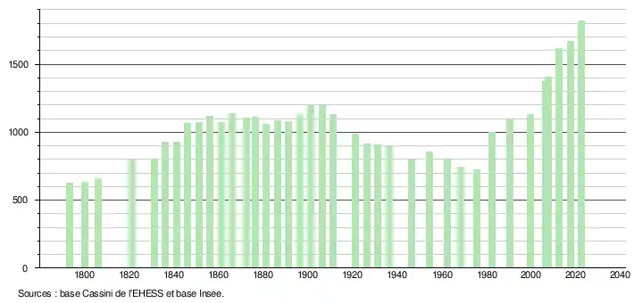 L'évolution du nombre d'habitants est connue à travers les recensements de la population effectués dans la commune depuis 1793. Pour les communes de moins de 10 000 habitants, une enquête de recensement portant sur toute la population est réalisée tous les cinq ans, les populations de référence des années intermédiaires étant quant à elles estimées par interpolation ou extrapolation[16]. Pour la commune, le premier recensement exhaustif entrant dans le cadre du nouveau dispositif a été réalisé en 2007[17].