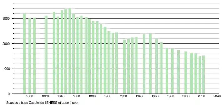 L'évolution du nombre d'habitants est connue à travers les recensements de la population effectués dans la commune depuis 1793. Pour les communes de moins de 10 000 habitants, une enquête de recensement portant sur toute la population est réalisée tous les cinq ans, les populations de référence des années intermédiaires étant quant à elles estimées par interpolation ou extrapolation[46]. Pour la commune, le premier recensement exhaustif entrant dans le cadre du nouveau dispositif a été réalisé en 2007[47].