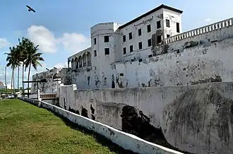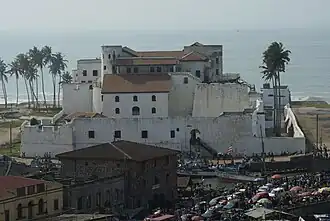 L'or du Ghana, jadis exporté via le Sahara, est désormais vendu majoritairement aux Portugais, attisant la convoitises des autres nations européennes[4]. En 1482, afin de se protéger leurs filières d'approvisionnement, l'explorateur Diogo de Azambuja arrive avec 600 hommes, dont une centaine de maçons, à bord de dix caravelles dont les cales sont remplies des matériaux nécessaires à la construction d'un premier fort[5]. Il négocie avec le roi local d’Eguafo, Nana Kwamena Ansah. Après avoir insisté sur les beautés du catholicisme et lui avoir proposé de se convertir, il lui demande l’autorisation de construire un fort sur les hauteurs de son village. Après un premier refus, il faut à Azambuja jouer de toute sa rhétorique et offrir beaucoup de cadeaux pour que les ouvriers se mettent au travail. 20 jours plus tard, ils achèvent la première enceinte du fort sur un plan carré avec quatre tours. Ainsi commence l'implantation portugaise sous le nom de São Jorge da Mina (Saint-Georges-de-la-Mine), premier comptoir commercial construit sur la côte de Guinée[6], et plus ancienne construction européenne qui existe encore aujourd'hui au sud du Sahara.