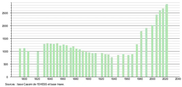 L'évolution du nombre d'habitants est connue à travers les recensements de la population effectués dans la commune depuis 1793. Pour les communes de moins de 10 000 habitants, une enquête de recensement portant sur toute la population est réalisée tous les cinq ans, les populations de référence des années intermédiaires étant quant à elles estimées par interpolation ou extrapolation[24]. Pour la commune, le premier recensement exhaustif entrant dans le cadre du nouveau dispositif a été réalisé en 2006[25].