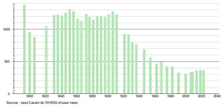 L'évolution du nombre d'habitants est connue à travers les recensements de la population effectués dans la commune depuis 1793. Pour les communes de moins de 10 000 habitants, une enquête de recensement portant sur toute la population est réalisée tous les cinq ans, les populations de référence des années intermédiaires étant quant à elles estimées par interpolation ou extrapolation[19]. Pour la commune, le premier recensement exhaustif entrant dans le cadre du nouveau dispositif a été réalisé en 2008[20].