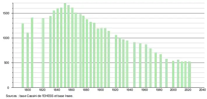 L'évolution du nombre d'habitants est connue à travers les recensements de la population effectués dans la commune depuis 1793. Pour les communes de moins de 10 000 habitants, une enquête de recensement portant sur toute la population est réalisée tous les cinq ans, les populations de référence des années intermédiaires étant quant à elles estimées par interpolation ou extrapolation[21]. Pour la commune, le premier recensement exhaustif entrant dans le cadre du nouveau dispositif a été réalisé en 2006[22].