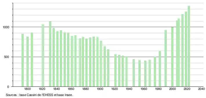 L'évolution du nombre d'habitants est connue à travers les recensements de la population effectués dans la commune depuis 1793. Pour les communes de moins de 10 000 habitants, une enquête de recensement portant sur toute la population est réalisée tous les cinq ans, les populations de référence des années intermédiaires étant quant à elles estimées par interpolation ou extrapolation[27]. Pour la commune, le premier recensement exhaustif entrant dans le cadre du nouveau dispositif a été réalisé en 2008[28].