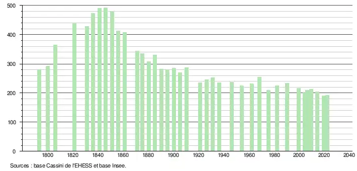 L'évolution du nombre d'habitants est connue à travers les recensements de la population effectués dans la commune depuis 1793. Pour les communes de moins de 10 000 habitants, une enquête de recensement portant sur toute la population est réalisée tous les cinq ans, les populations de référence des années intermédiaires étant quant à elles estimées par interpolation ou extrapolation[16]. Pour la commune, le premier recensement exhaustif entrant dans le cadre du nouveau dispositif a été réalisé en 2004[17].