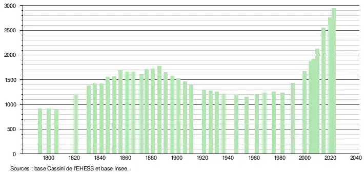 | L'évolution du nombre d'habitants est connue à travers les recensements de la population effectués dans la commune depuis 1793. Pour les communes de moins de 10 000 habitants, une enquête de recensement portant sur toute la population est réalisée tous les cinq ans, les populations de référence des années intermédiaires étant quant à elles estimées par interpolation ou extrapolation[30]. Pour la commune, le premier recensement exhaustif entrant dans le cadre du nouveau dispositif a été réalisé en 2004[31]. En 2022, la commune comptait 2 946 habitants[Note 3], en évolution de +11,97 % par rapport à 2016 (Landes : +5,78 %, France hors Mayotte : +2,11 %). |