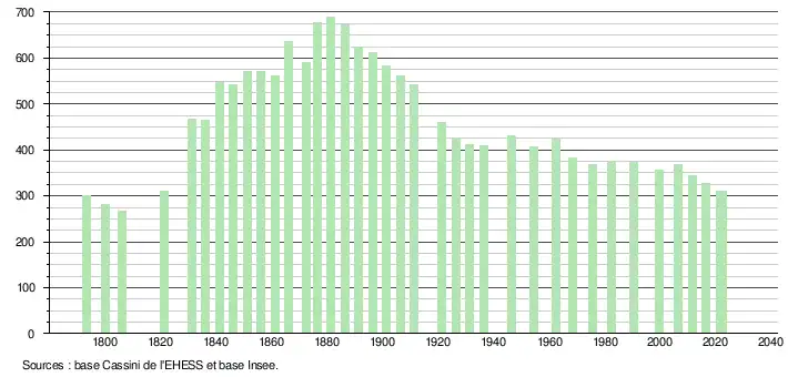 L'évolution du nombre d'habitants est connue à travers les recensements de la population effectués dans la commune depuis 1793. Pour les communes de moins de 10 000 habitants, une enquête de recensement portant sur toute la population est réalisée tous les cinq ans, les populations de référence des années intermédiaires étant quant à elles estimées par interpolation ou extrapolation[14]. Pour la commune, le premier recensement exhaustif entrant dans le cadre du nouveau dispositif a été réalisé en 2006[15].