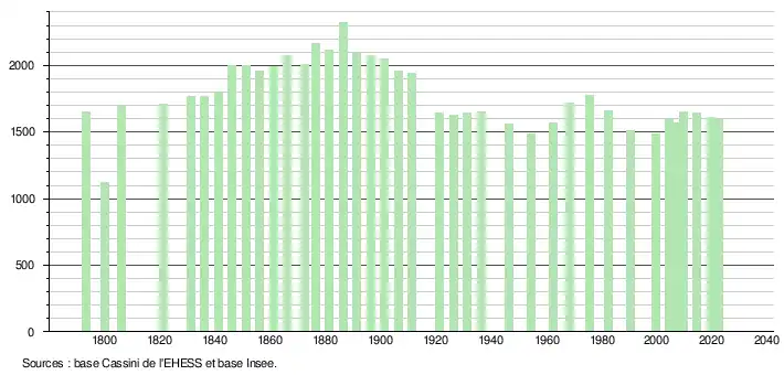 L'évolution du nombre d'habitants est connue à travers les recensements de la population effectués dans la commune depuis 1793. Pour les communes de moins de 10 000 habitants, une enquête de recensement portant sur toute la population est réalisée tous les cinq ans, les populations de référence des années intermédiaires étant quant à elles estimées par interpolation ou extrapolation[14]. Pour la commune, le premier recensement exhaustif entrant dans le cadre du nouveau dispositif a été réalisé en 2004[15].