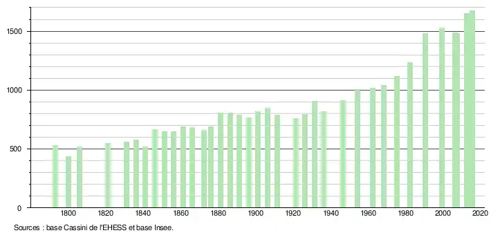 L'évolution du nombre d'habitants est connue à travers les recensements de la population effectués dans la commune depuis 1793. Pour les communes de moins de 10 000 habitants, une enquête de recensement portant sur toute la population est réalisée tous les cinq ans, les populations de référence des années intermédiaires étant quant à elles estimées par interpolation ou extrapolation[26]. Pour la commune, le premier recensement exhaustif entrant dans le cadre du nouveau dispositif a été réalisé en 2007[27].