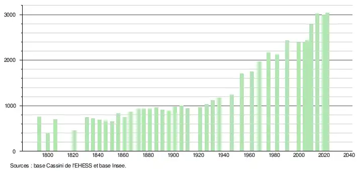 L'évolution du nombre d'habitants est connue à travers les recensements de la population effectués dans la commune depuis 1793. Pour les communes de moins de 10 000 habitants, une enquête de recensement portant sur toute la population est réalisée tous les cinq ans, les populations de référence des années intermédiaires étant quant à elles estimées par interpolation ou extrapolation[20]. Pour la commune, le premier recensement exhaustif entrant dans le cadre du nouveau dispositif a été réalisé en 2004[21].