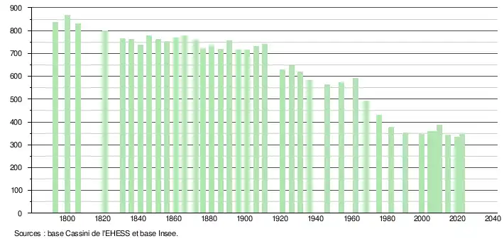 L'évolution du nombre d'habitants est connue à travers les recensements de la population effectués dans la commune depuis 1793. Pour les communes de moins de 10 000 habitants, une enquête de recensement portant sur toute la population est réalisée tous les cinq ans, les populations de référence des années intermédiaires étant quant à elles estimées par interpolation ou extrapolation[19]. Pour la commune, le premier recensement exhaustif entrant dans le cadre du nouveau dispositif a été réalisé en 2004[20].