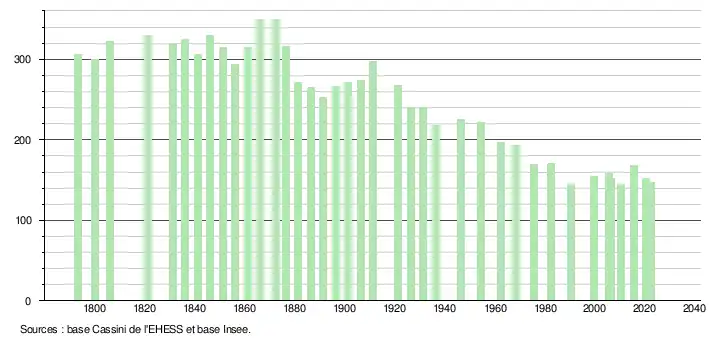 L'évolution du nombre d'habitants est connue à travers les recensements de la population effectués dans la commune depuis 1793. Pour les communes de moins de 10 000 habitants, une enquête de recensement portant sur toute la population est réalisée tous les cinq ans, les populations de référence des années intermédiaires étant quant à elles estimées par interpolation ou extrapolation[21]. Pour la commune, le premier recensement exhaustif entrant dans le cadre du nouveau dispositif a été réalisé en 2005[22].