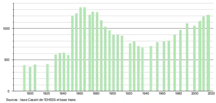 L'évolution du nombre d'habitants est connue à travers les recensements de la population effectués dans la commune depuis 1793. Pour les communes de moins de 10 000 habitants, une enquête de recensement portant sur toute la population est réalisée tous les cinq ans, les populations de référence des années intermédiaires étant quant à elles estimées par interpolation ou extrapolation[6]. Pour la commune, le premier recensement exhaustif entrant dans le cadre du nouveau dispositif a été réalisé en 2005[7].