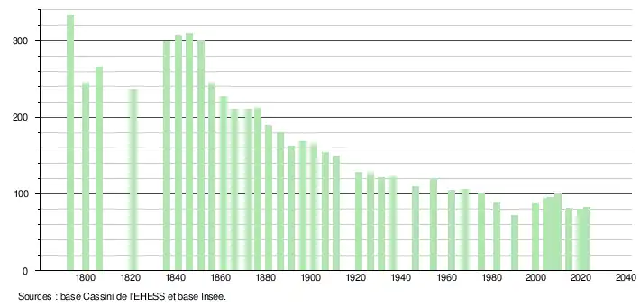 L'évolution du nombre d'habitants est connue à travers les recensements de la population effectués dans la commune depuis 1793. Pour les communes de moins de 10 000 habitants, une enquête de recensement portant sur toute la population est réalisée tous les cinq ans, les populations de référence des années intermédiaires étant quant à elles estimées par interpolation ou extrapolation[26]. Pour la commune, le premier recensement exhaustif entrant dans le cadre du nouveau dispositif a été réalisé en 2004[27].